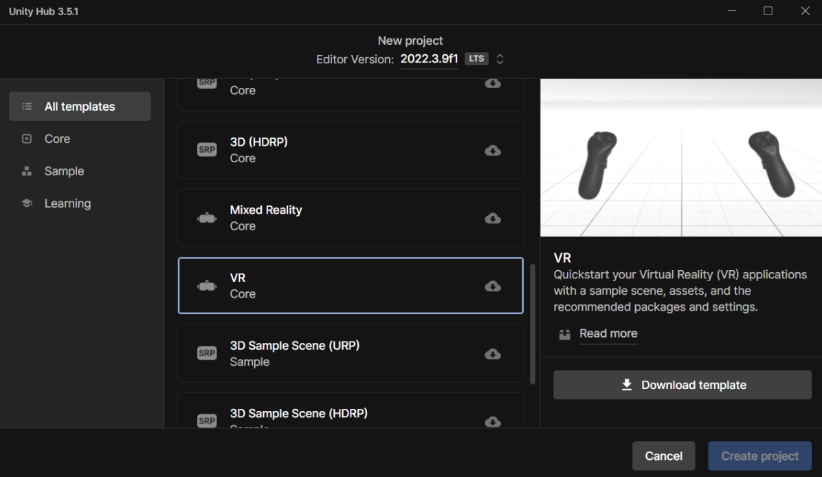 The process starts by creation of a scene that has all necessary game objects and components for building a VR application. In this instance, we will use a premade Sample Scene made by Unity as it includes all necessities. The scene can be found as part of “VR core” project in the Unity hub as can be seen below: