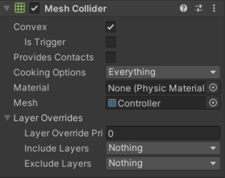 We leave the collision layer set to “Default” as we don’t need any additional layers for this example. We make sure as well that “is Trigger” is unchecked, as otherwise the controllers will not detect the mesh.